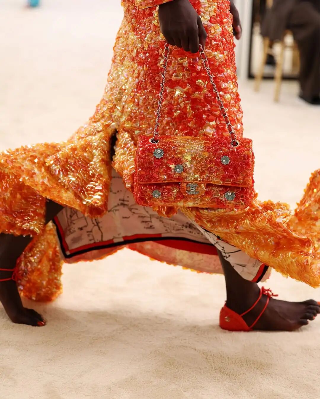 其中最吸睛的,就是鞋履部分出现频率最高也最特别的一双仅保留了鞋跟部分的凉鞋。