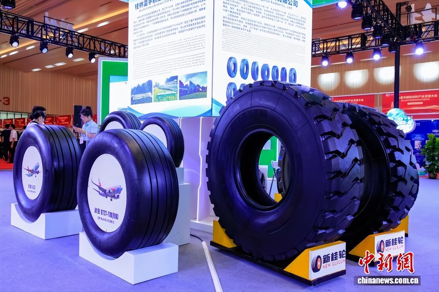 图为桂林蓝宇航空轮胎发展有限公司研制的飞机轮胎(左)。杨宗盛 摄