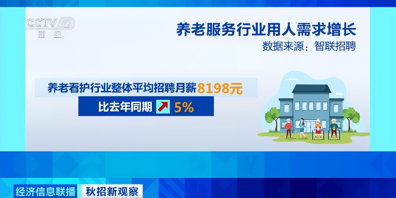 数据显示,今年三季度,养老看护行业的招聘需求同比上涨39%,其中,护工、护士、康复治疗师等相关岗位需求较多。从薪资待遇上来看,养老看护行业整体平均招聘月薪是8198元,比去年同期提高5%。
