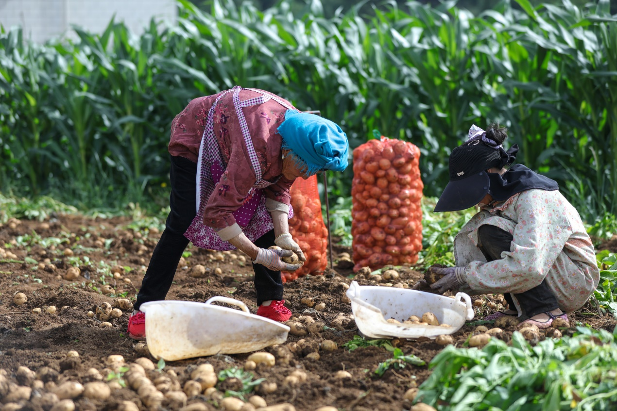 昭通市鲁甸县东南部,海拔2200米的山上气候温凉,是适合马铃薯生长的绝佳地带。随着锄头一起一落,金黄的马铃薯露出小脑袋,村民捧起一捧掸去泥土,放进身后的篮子里。