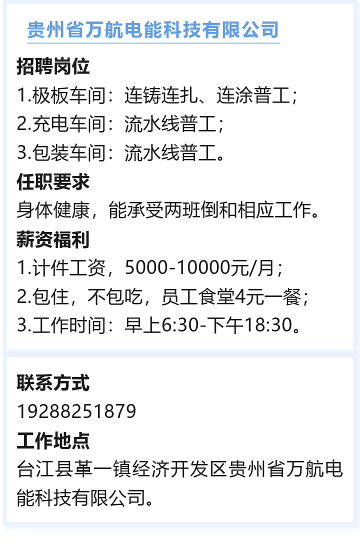 贵州省万航电能科技有限公司招聘!月薪5000-10000元!包吃!