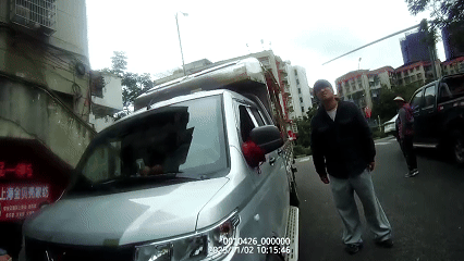 辅警见状立即使用喊话器示意货车驾驶人驶离,然而驾驶人听到喊话后,虽然上了车,却迟迟没有启动车辆。