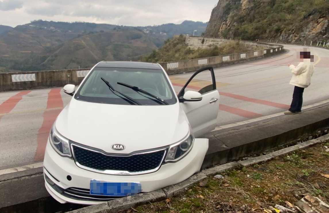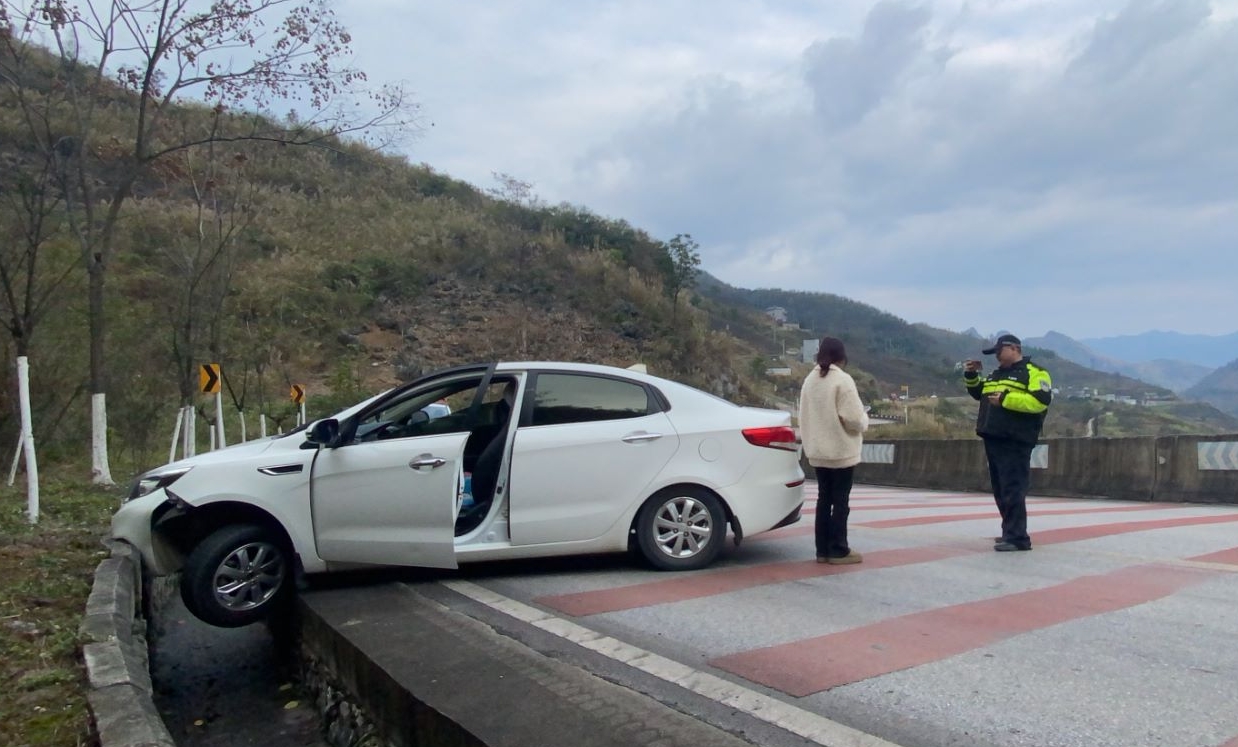 接警后,事故值班民警立即赶往现场,在现场,只见事故路段是在一个弯道处,事故车辆为一辆白色小轿车,小轿车的车头撞向了路边堡坎,前轮悬在排水沟上,保险杠有受损情况。小轿车驾驶员心有余悸地说:“我的速度就四十码,然后方向就打滑,根本掌控不了,就撞到这里了。”
