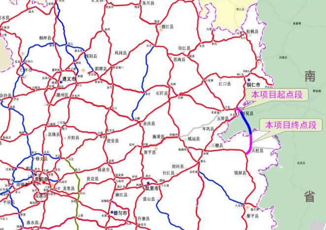 G6512秀山至从江国家高速公路玉屏至天柱段(贵州境)工程是国家高速公路网的重要路段,在国家和区域路网中具有重要地位。项目起于玉屏侗族自治县田坪镇黄母冲枢纽互通,顺接已建成江口至玉屏高速公路,终点位于天柱县城西侧乐寨枢纽互通,与三黎高速公路顺联,贵州境全长33.091公里。设计速度100公里/小时。前段玉屏境长度8.718公里,采用六车道高速公路合同段准,路基宽度33.5米;后段天柱境长度24.375公里,采用四车道高速公路合同段准,路基宽度26米。全线桥隧比39.37%(桥梁占比35.46%、隧道占比3.91%),桥涵荷载等级公路-I级。全线共设互通式立交7座,其中枢纽互通2座、落地互通4座(新建收费站3处、利用现有天柱互通收费站1处)、预留互通接线1处,服务区1处。