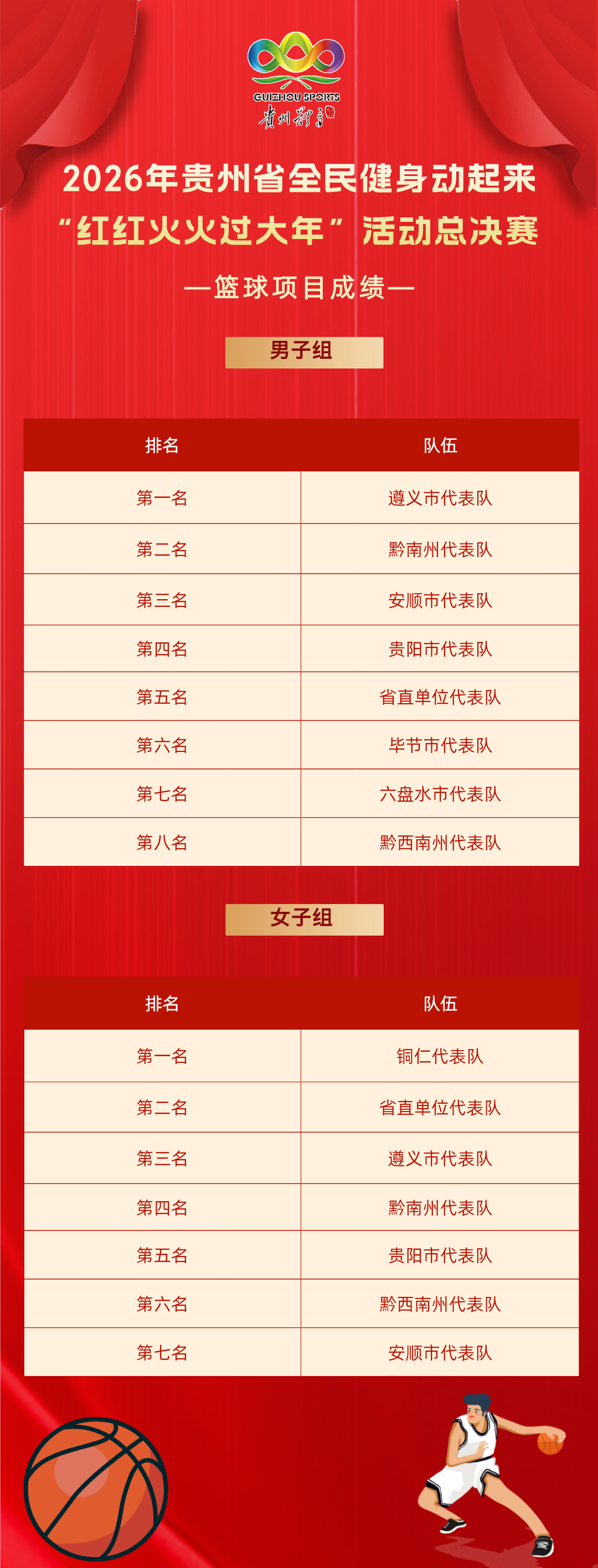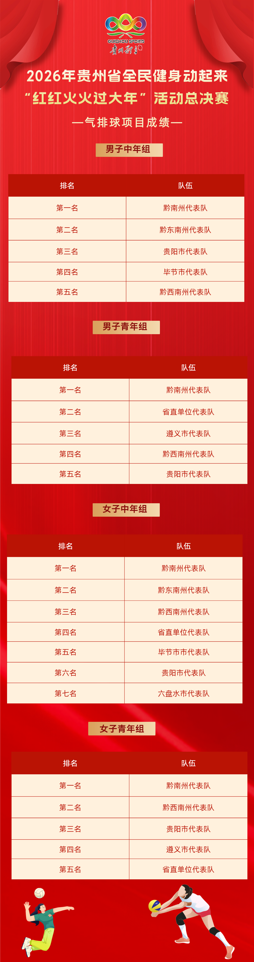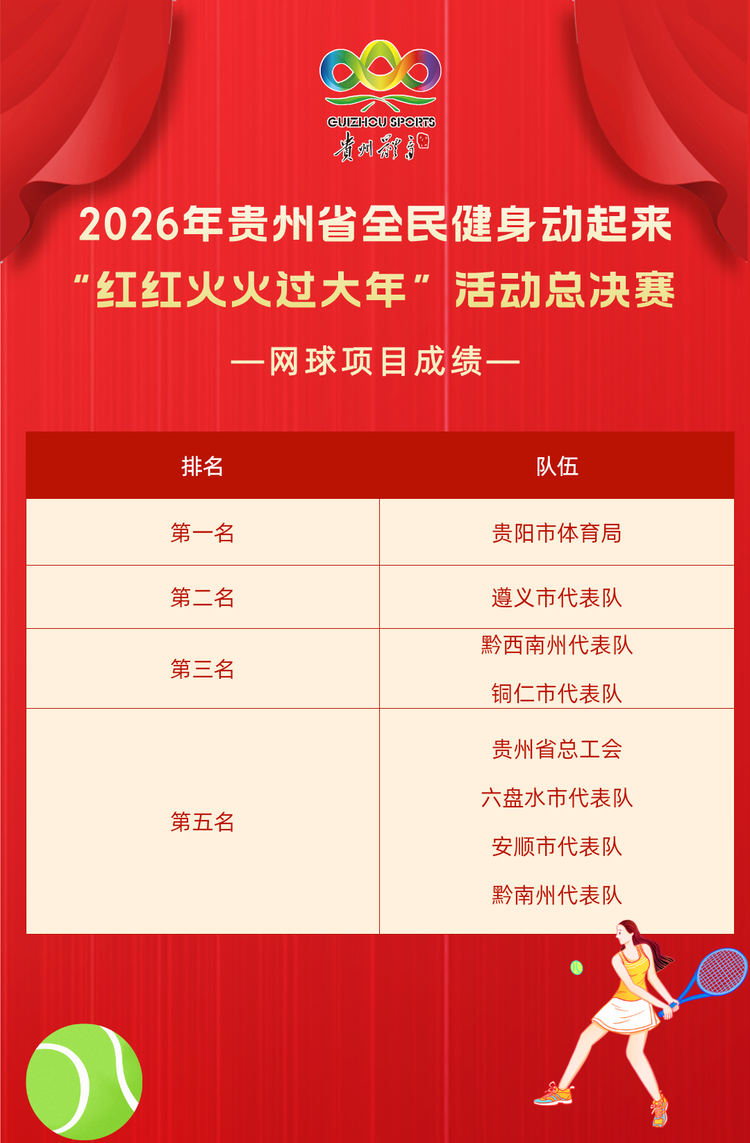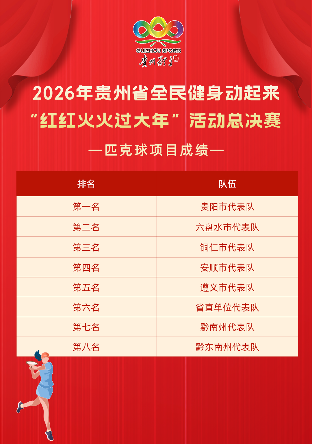 3月29日,2026年贵州省全民健身动起来“红红火火过大年”系列活动总决赛圆满完赛,篮球、气排球、网球、羽毛球、乒乓球、匹克球、轮滑七个项目的成绩揭晓。