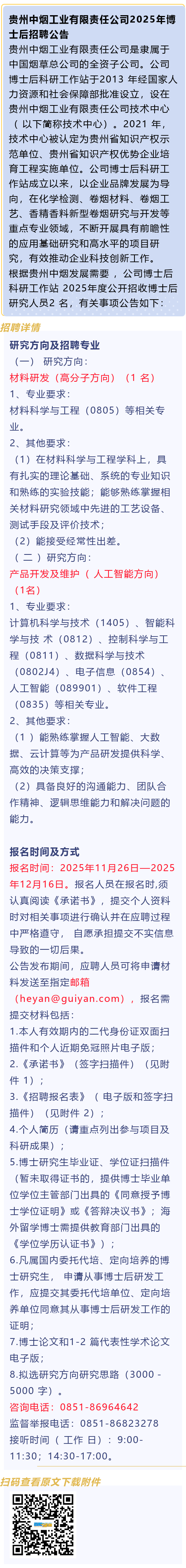 【国企】贵州中烟工业有限责任公司招聘!报名截止时间:12月16日!