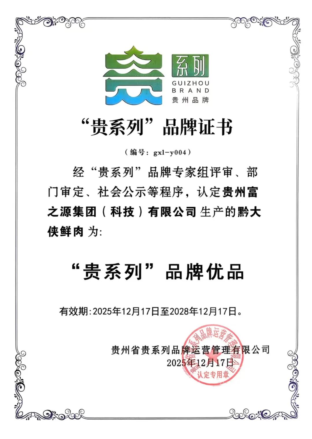 12月17日,在由贵州省人民政府民族工作联席会议办公室、贵州省质量监督和知识产权管理工作领导小组办公室联合主办的第二批“贵系列”品牌发布会上,贵州富之源集团“黔大侠”高品质猪肉荣获“贵系列”品牌优品认证。