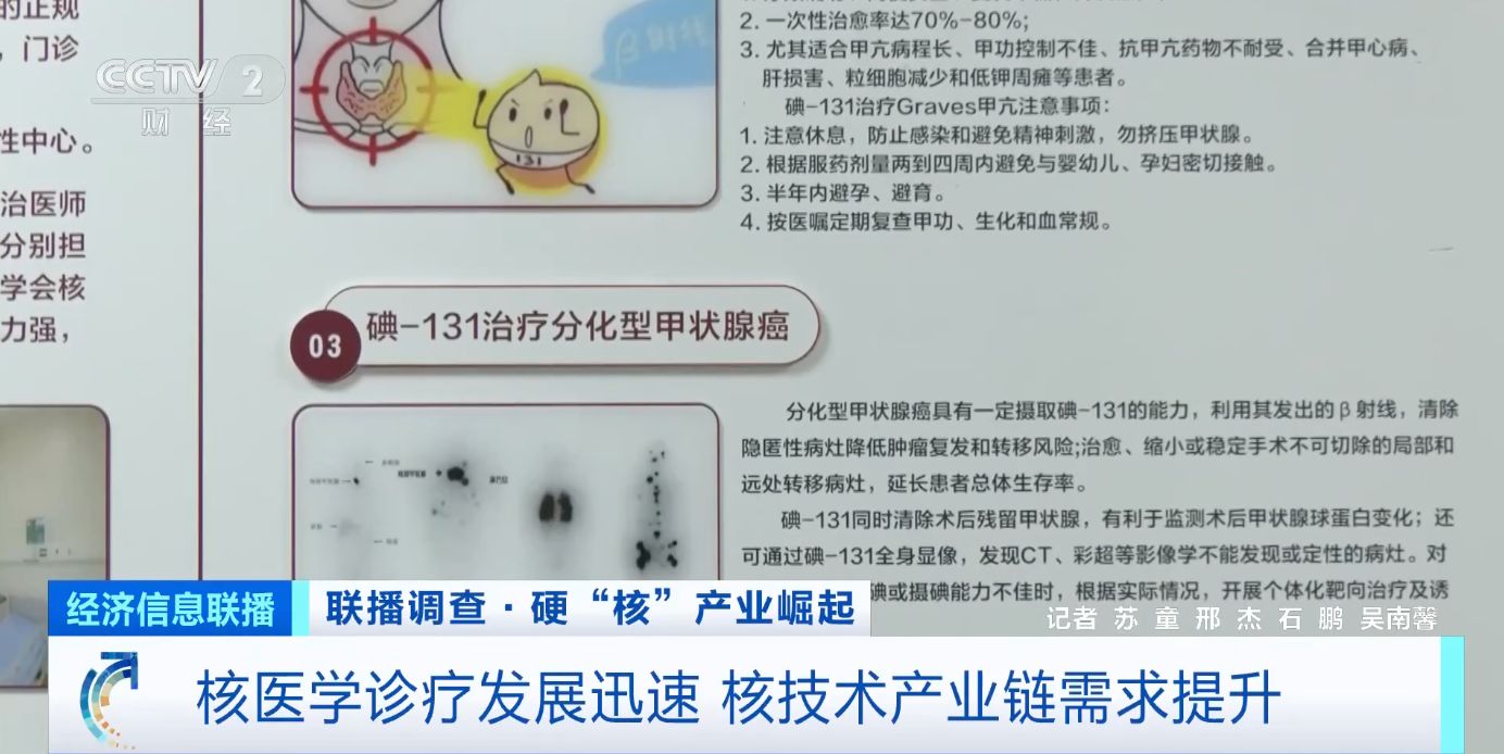 业内人士表示,核医学近年来发展迅速,用途不断拓展。诊断方面,已能覆盖肿瘤、神经精神、心脏和骨骼系统等显像。治疗方面,近年一些核素新药的问世,如镥-177相关药物治疗前列腺癌、钇-90应用于肝癌治疗等,也让核医学覆盖的人群范围不断扩大。目前,全国已有近1500家医院设立核医学科,需求的增加也对核技术产业链提出了更高要求。