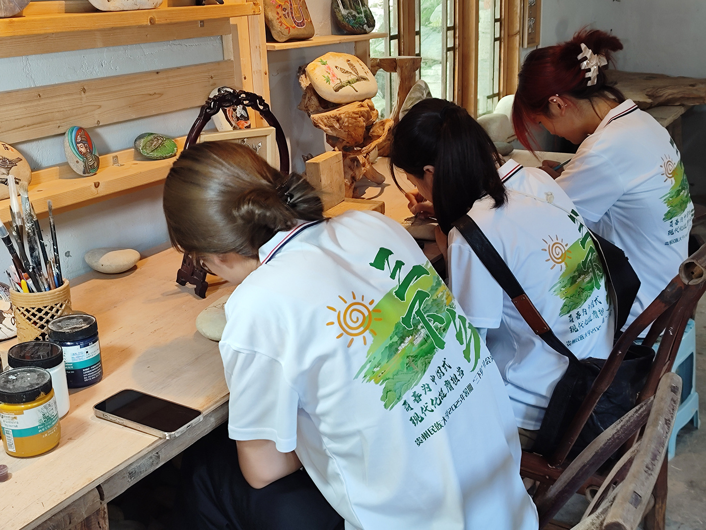 午后的“陶艺石彩画体验工坊”里,负责人陆向勇为实践团队讲解了红陶制作工艺与布依族传统石彩画的渊源:“你们看这些太阳纹、水波纹,这是我们祖先对天地的热爱与敬畏。”团队成员研磨颜料,在石头上勾勒图案,指尖触碰的不仅是泥土与矿石,更是布依族世代相传的宇宙观与审美意识。“原来每一道纹路都有故事,这不仅是精湛的手艺,更是活态的历史。”星空大地队团队负责人莫业晗在体验日志中写道。