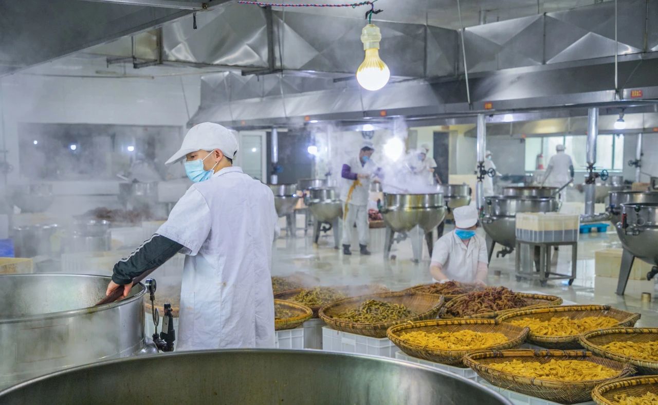 在万山区江宗纯味食品有限公司煮制车间里,工人们正熟练地对鸭脖、鸭翅、藕片等食材进行卤煮。一旁的打包车间里,工人们则仔细对照出货单,将一袋袋分拣好的卤味进行称重装箱。