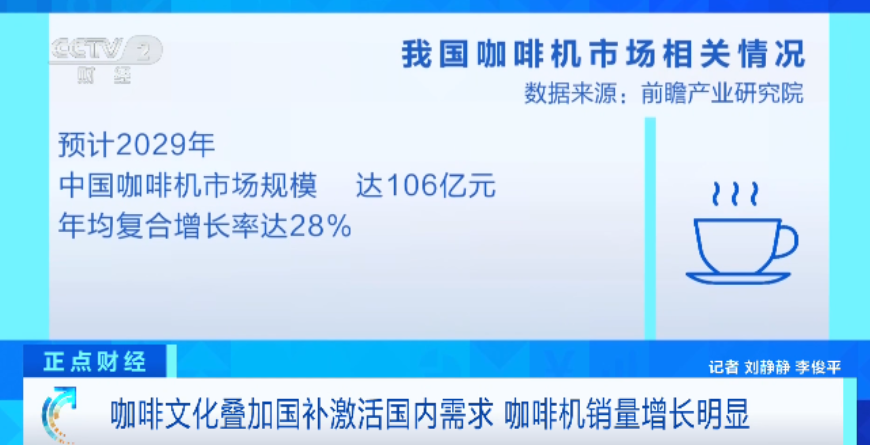 数据显示,2025年1至8月,国内咖啡机销量为168.3万台,同比增长75.6%。到2029年,中国咖啡机市场规模有望达到106亿元,年均复合增长率预计高达28%。