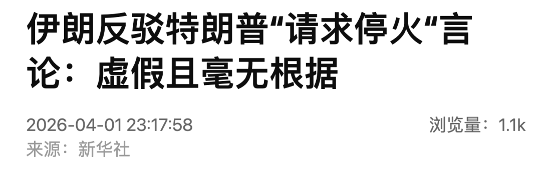 据伊朗新闻电视台4月1日报道,伊朗外交部发言人表示,美国总统特朗普所谓伊朗请求停火的言论“虚假且毫无根据”。