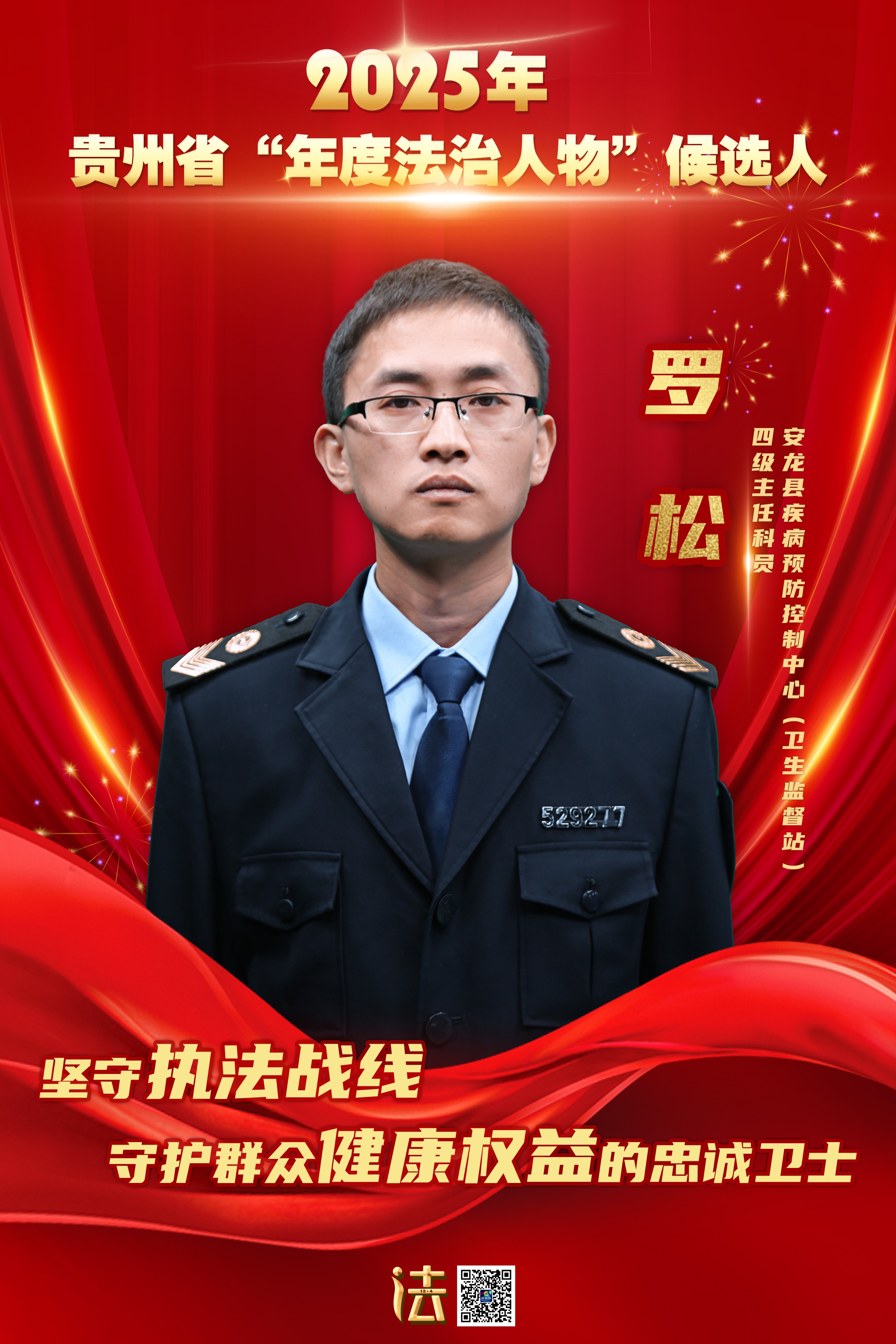 罗松,黔西南州安龙县疾病预防控制中心(卫生监督站)四级主任科员。2012年考入安龙县卫生监督所以来,他累计办案300余件,实现“零败诉”,荣获贵州省“五一劳动奖章”,2022年贵州省卫生健康监督执法技能竞赛医疗卫生组个人一等奖,2025年贵州省公共卫生和传染病防治监督技能竞赛传染病防治监督项目个人一等奖,“黔西南州卫生监督十佳办案能手”“黔西南州卫生监督先进个人”等多项荣誉,受聘为州法学会首席法律咨询专家。他以专业为盾,以温度为刃,在平凡岗位上筑起一道守护健康的坚实防线。