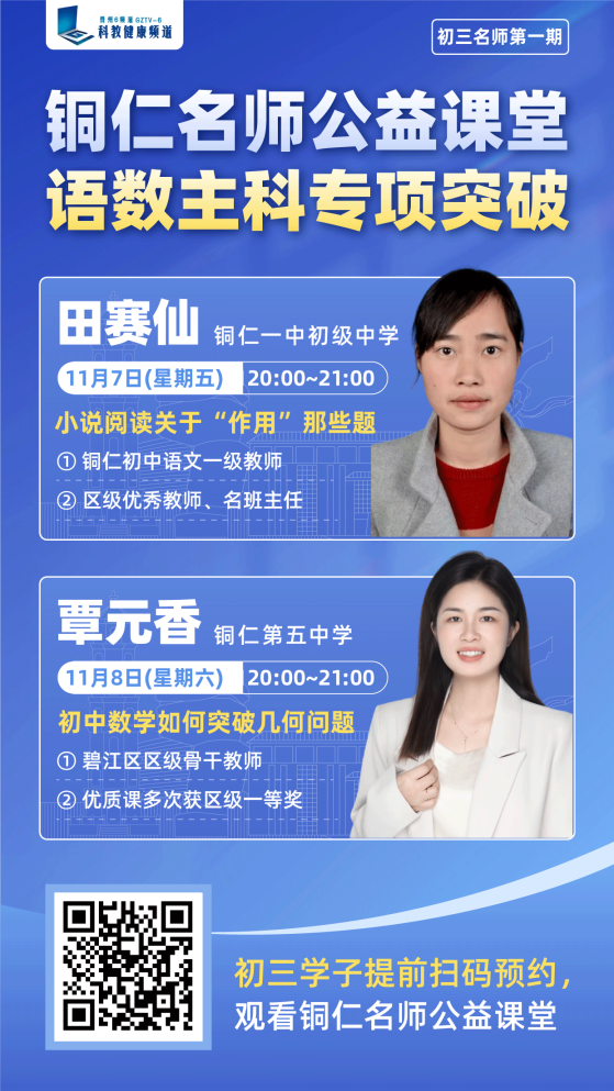 期中复习关键期已至,本周特邀铜仁一中初级中学、铜仁五中两位名师,聚焦语文、数学核心难点,为初三学子量身定制提分攻略!全市中考学子务必锁定直播间,高效备战期中!