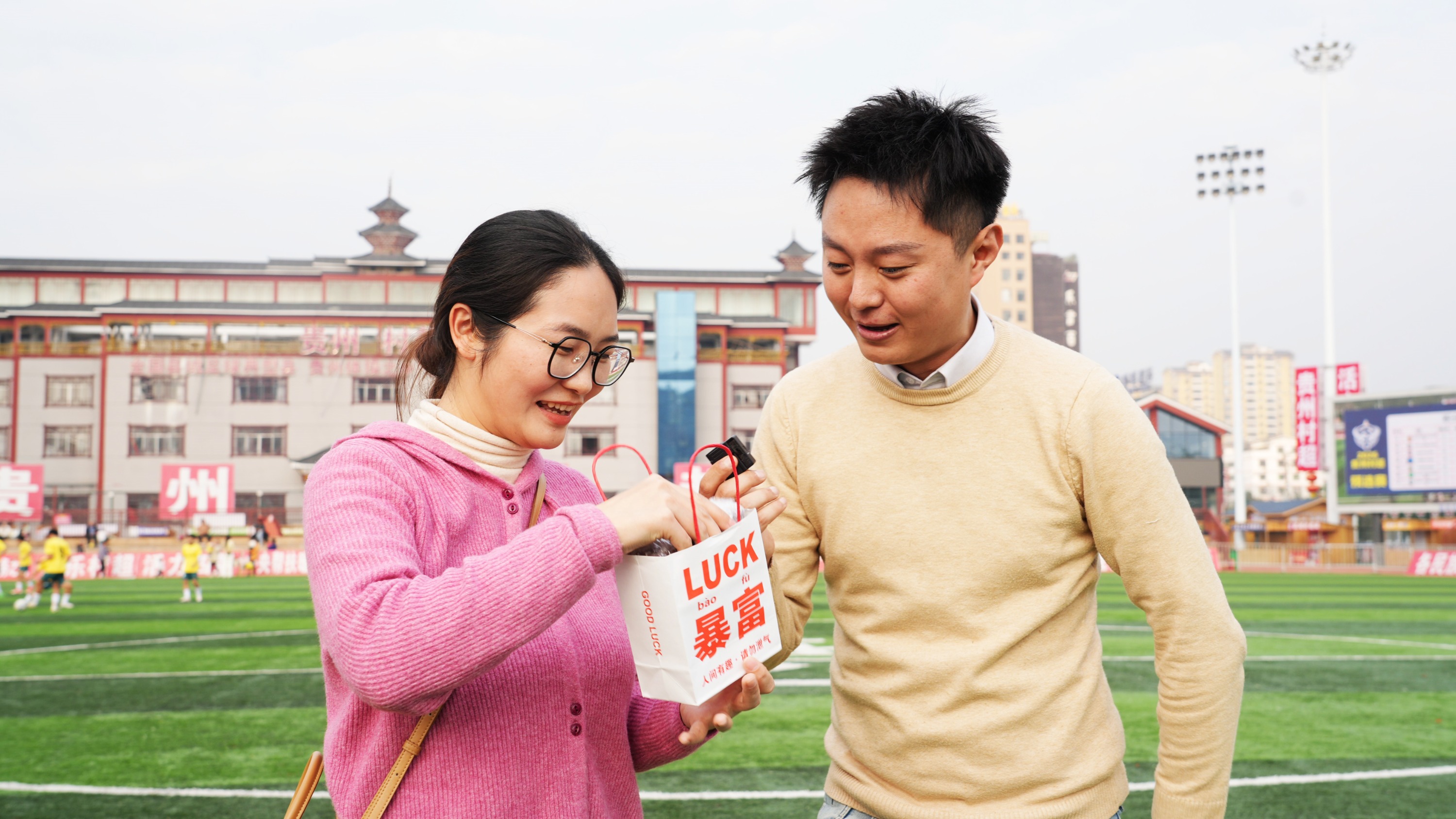 随着“村超”赛事进入中场休息,受邀担任“推普形象大使”的村超球员走进镜头,用普通话生动介绍家乡的山水风光与风土人情,并现场教学苗语、侗语趣味词汇,一句句方言“加油”响彻赛场,实现了普通话与民族语言的和谐共鸣。