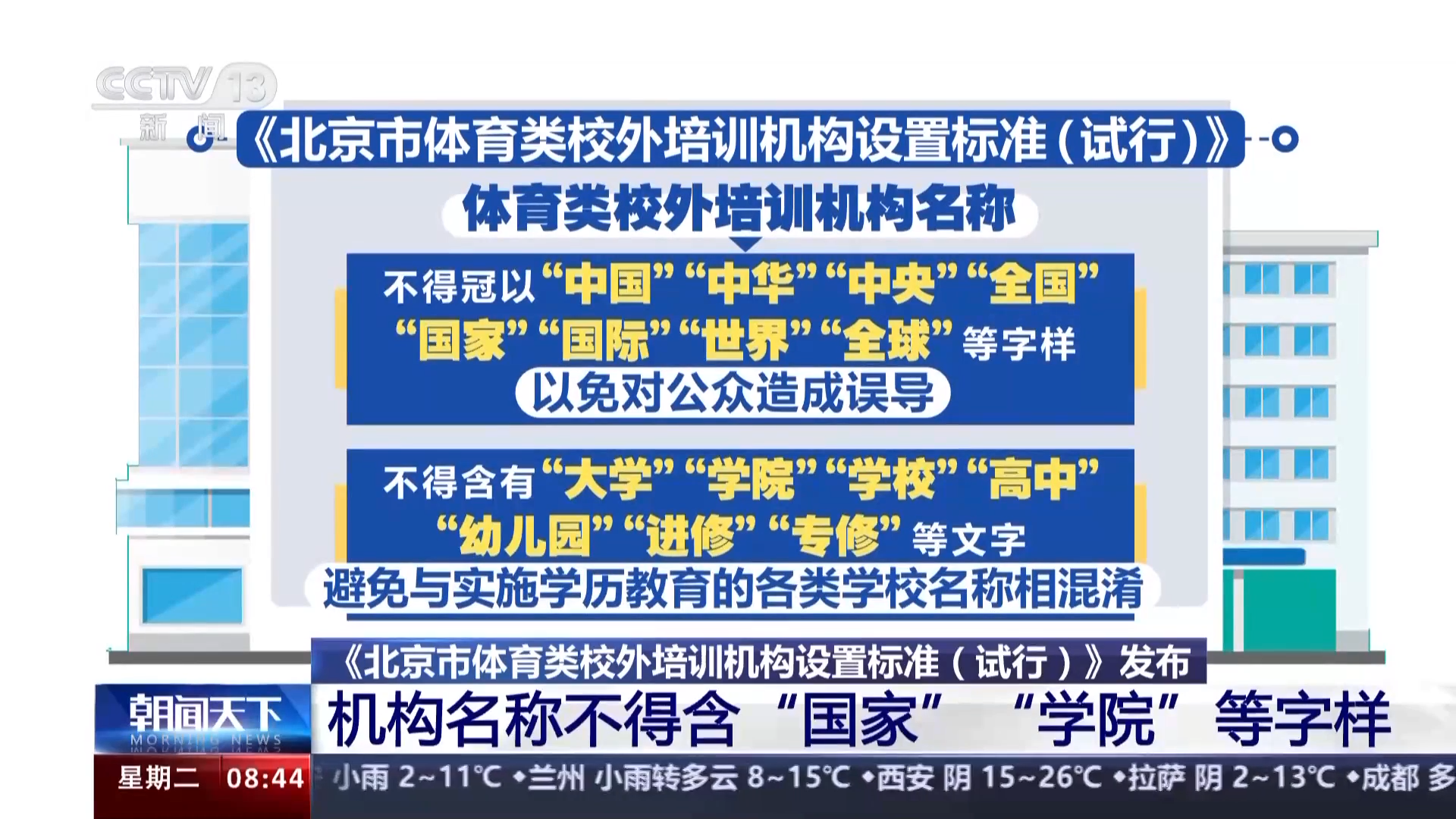 日前,北京市教委、北京市体育局发布《北京市体育类校外培训机构设置标准(试行)》,明确体育类校外培训机构不得以任何形式与体育中考等挂钩,不得以任何形式开设学科类课程内容。