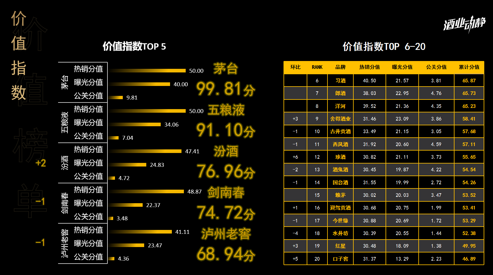 汾酒凭借76.96分跃居第三,热销分值47.41,曝光分值24.83,公关分值4.72。汾酒的强势崛起,凸显其品牌建设的良好效果,尤其是在市场拓展和文化营销方面。