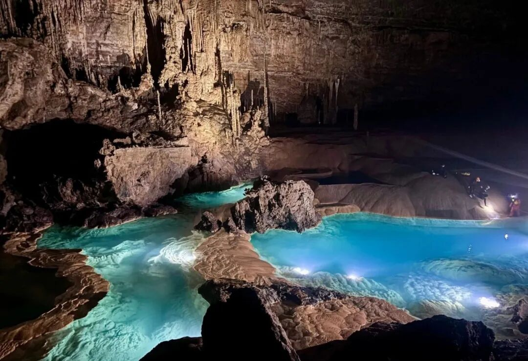 石龙洞位于贵阳市清镇市,是一个天然的水溶洞,也是贵州边石坝景观、梯级钙化池最具代表性的原生态喀斯特水溶洞之一。秋日水位回落更显静谧深邃。30余级梯级钙华池如蓝宝石层层铺展,钟乳石在光影中幻化出“石龙飞天”“玉树琼花”等奇观。可以划桨板穿行暗河,当灯光映照在水面上泛起“蓝眼泪”般的光泽,偶有落叶从洞顶缝隙飘入,与亿万年石笋构成时空交错的画面。