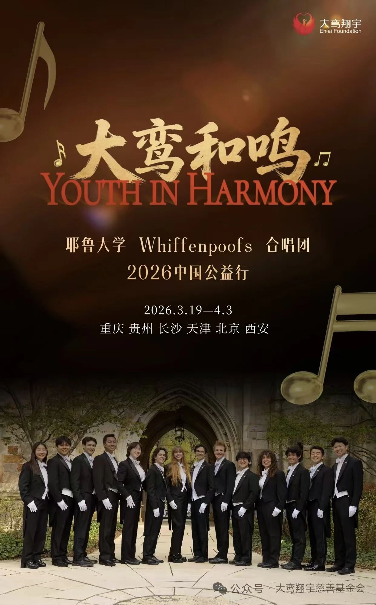 为响应习近平总书记“中美关系的希望在人民、未来在青年”的指示,积极参与“五年邀请五万名美国青少年来华交流学习”的倡议,北京大鸾翔宇慈善基金会特别设立“大鸾和鸣——中外青少年文化艺术交流项目”。本次耶鲁大学Whiffenpoofs合唱团2026中国公益行,即为该项目的首发活动。