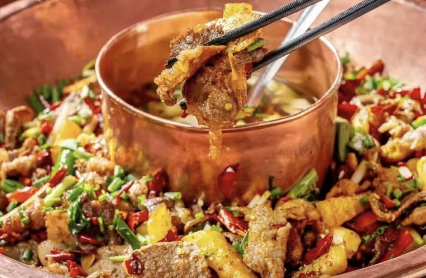 铜锅烹制的黄牛肉香气四溢,干锅香辣、清汤鲜美,蘸特制辣椒水香到跺脚。