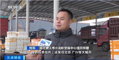 湖北潜江小龙虾交易中心值班经理 刘军:除供应本地外,还发往北京、广州等城市,每天的发货量约一百吨。