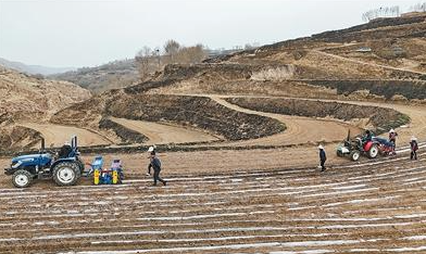3月下旬,青海省民和回族土族自治县马营镇菜园村山坡上,两台膜侧小麦播种机灵活穿梭,田里铺满规整的地膜垄带。