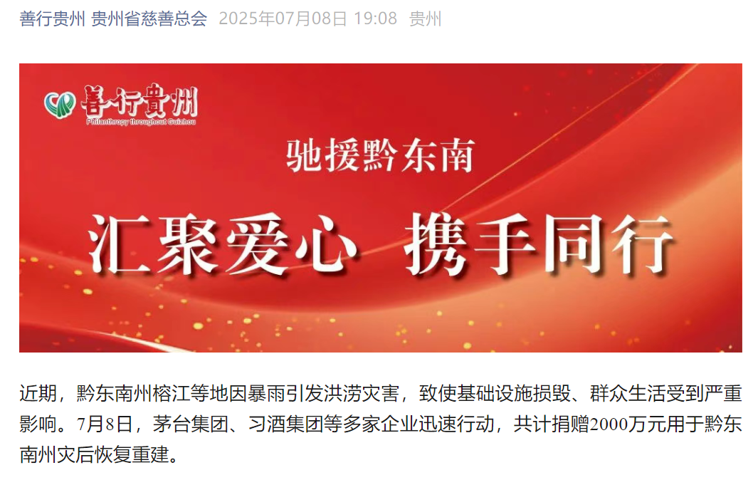 7月8日,据贵州省慈善总会发布信息,贵州多家知名企业迅速响应黔东南暴雨灾情援助,茅台集团、习酒集团等多家企业共同捐赠善款总计2000万元,为榕江等受灾地区重建贡献力量。