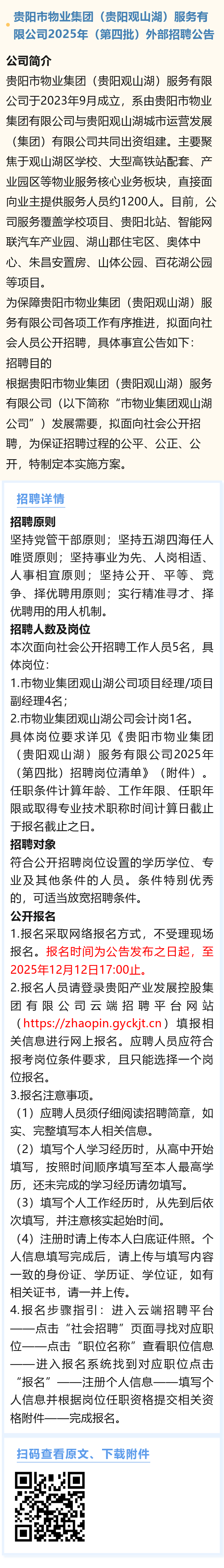 【国企】贵阳市物业集团(贵阳观山湖)服务有限公司招聘!报名截止时间:2025年12月12日!