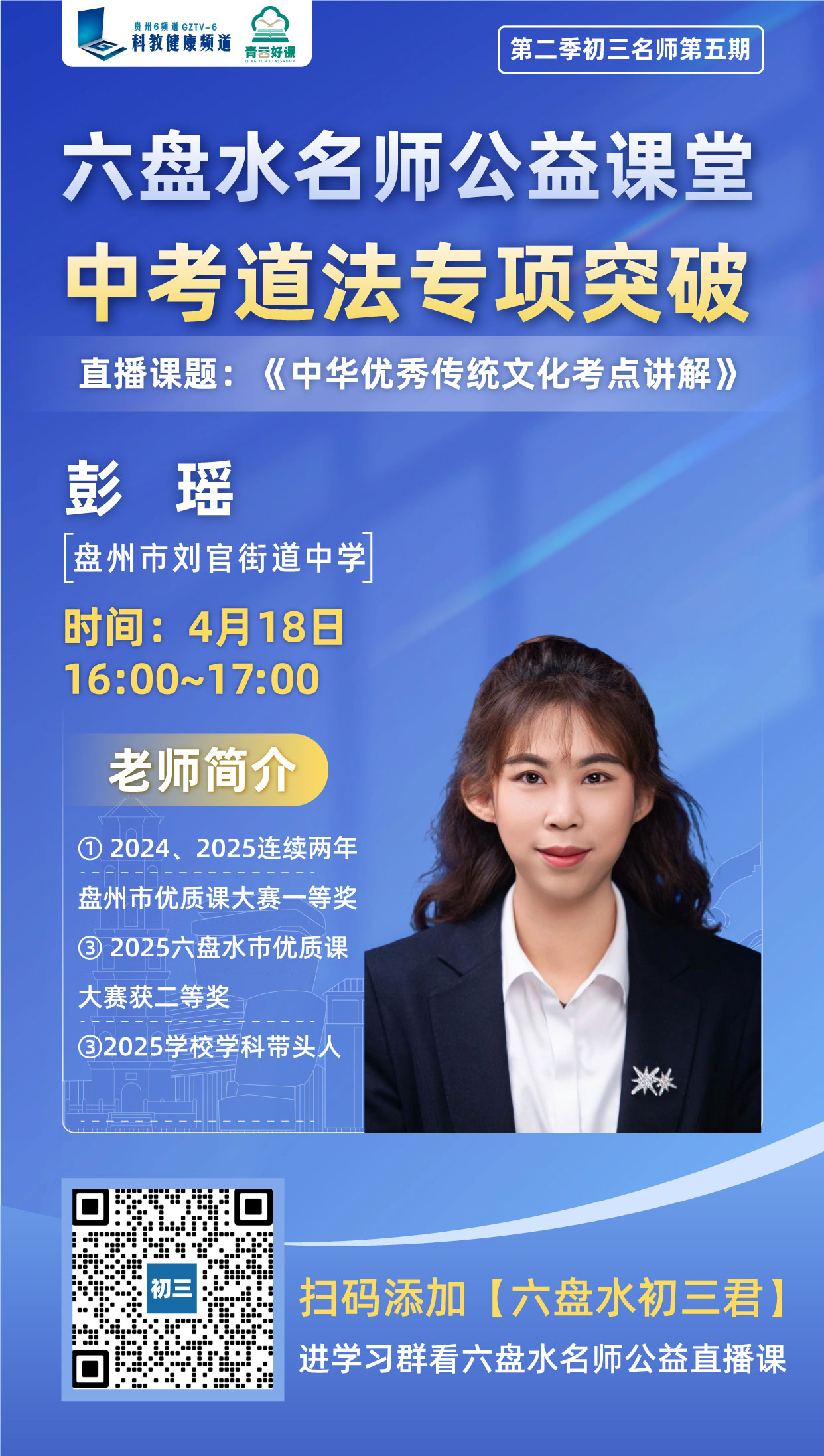 为深入贯彻落实教育惠民政策,切实解决学子备考中的实际困惑,由贵州广播电视台教育事业部与盘州市教育局联合主办、盘州市各初级中学深度参与的《青云好课・盘州名师公益直播课堂》(第二季)第五期将于本周六(4月18日)下午16:00—17:00;20:00—21:00准时开播。这是专为初三学子定制的全免费、高含金量中考冲刺公益课,贵州广播电视台以 “青云” 为名,打造名师公益直播课。依托全省顶尖名师资源,把优质课堂搬上 “云端”,跨越山川惠及更多学子。以名师引路、课程为介,助学子拾级而上,触摸属于自己的“青云之志”。“青云好课”愿做托举之风,助力每个孩子的梦想都如“青云”般“云程发轫,万里可期”。
