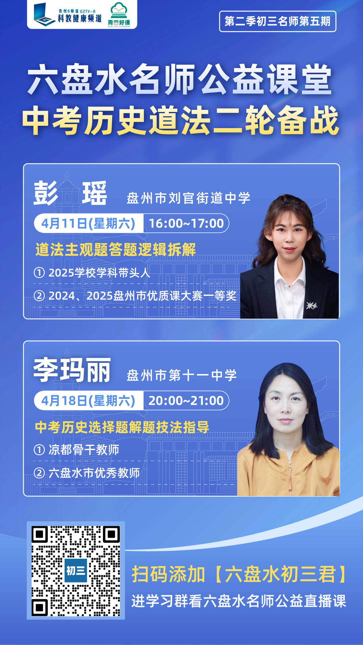 本周邀请盘州市刘官街道中学彭瑶老师和盘州市第十一中学李玛丽老师给大家带来中考历史、道法二轮专属备战复习课!