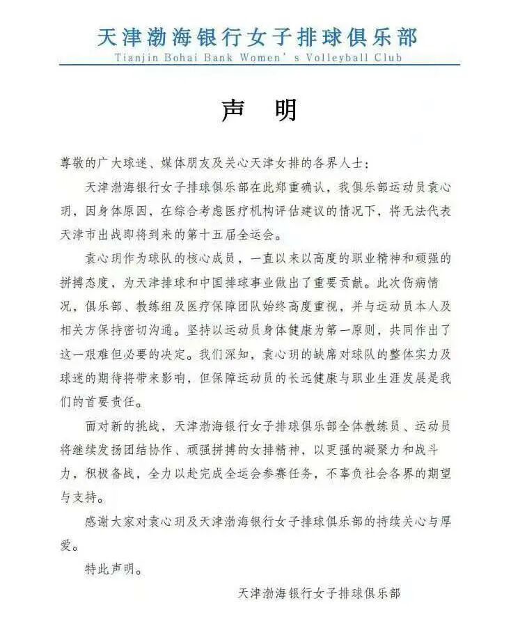 天津渤海银行女排俱乐部17日深夜发布声明称,袁心玥因伤病原因将缺席第十五届全运会。
