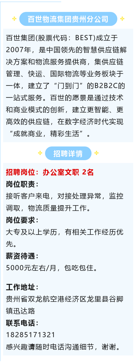 【双龙航空港经济区】百世物流集团贵州分公司招聘办公室文职!月薪5000元左右、包吃包住!