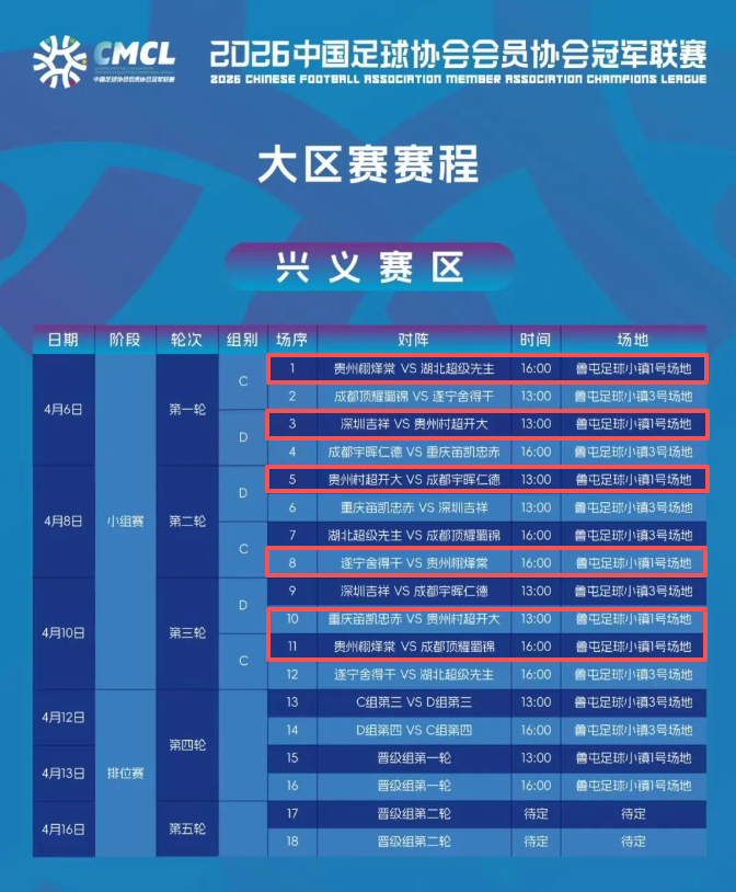 近日,2026中冠联赛大区赛赛程出炉,贵州栩烽棠、贵州村超开大、贵州飞鹰分别位于兴义和曲靖赛区,对手已确定。