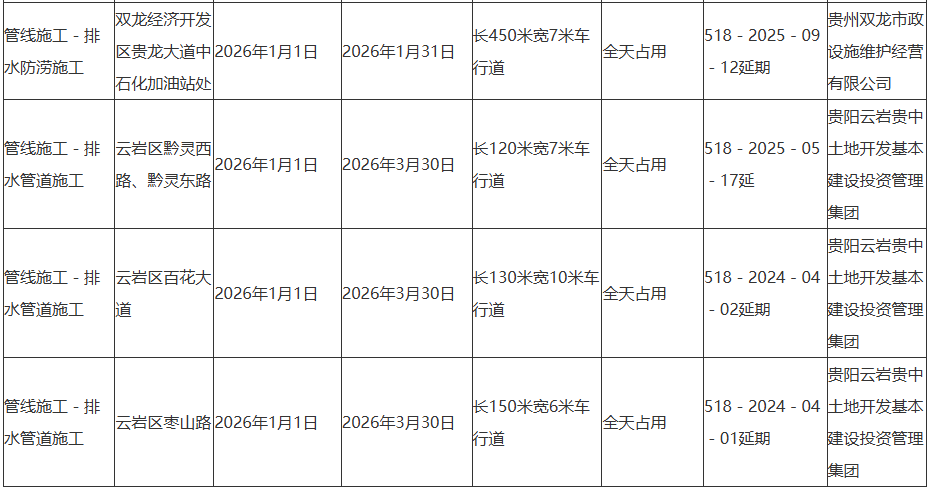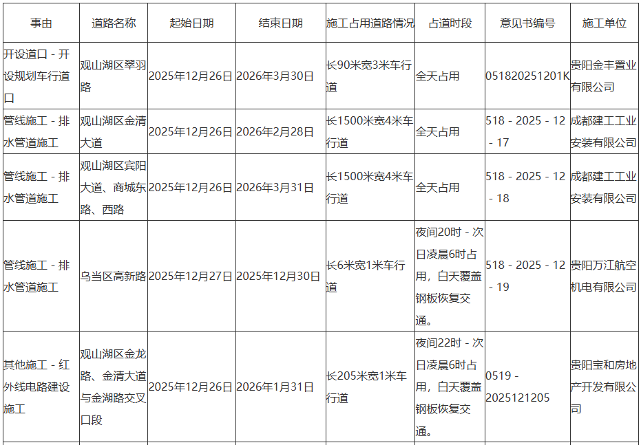 贵阳市观山湖区翠羽路等近期临时占用道路施工提示