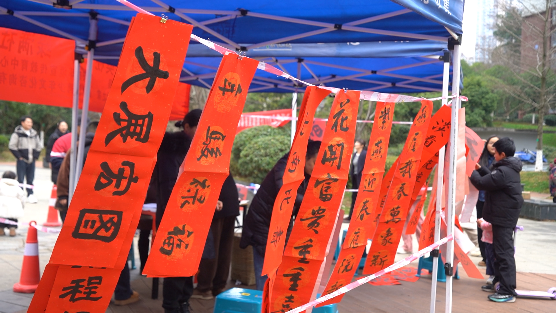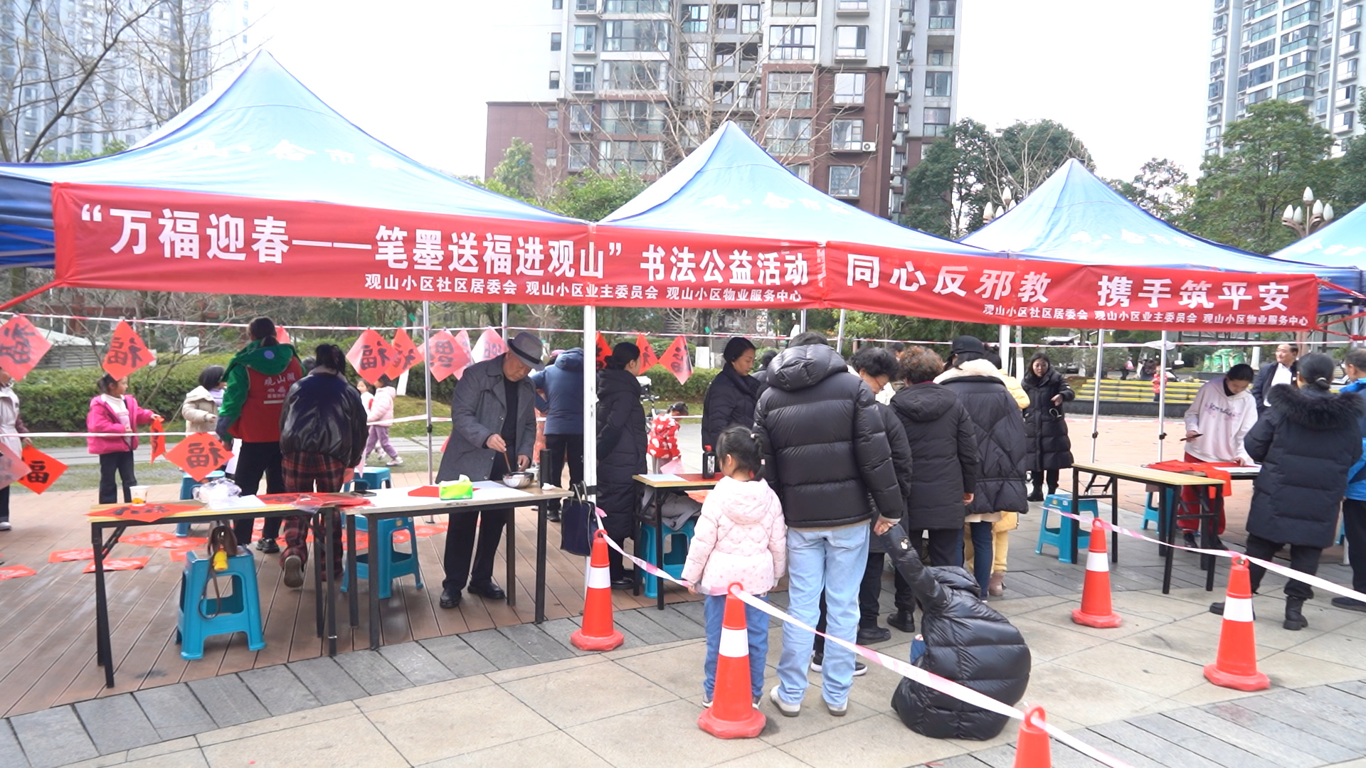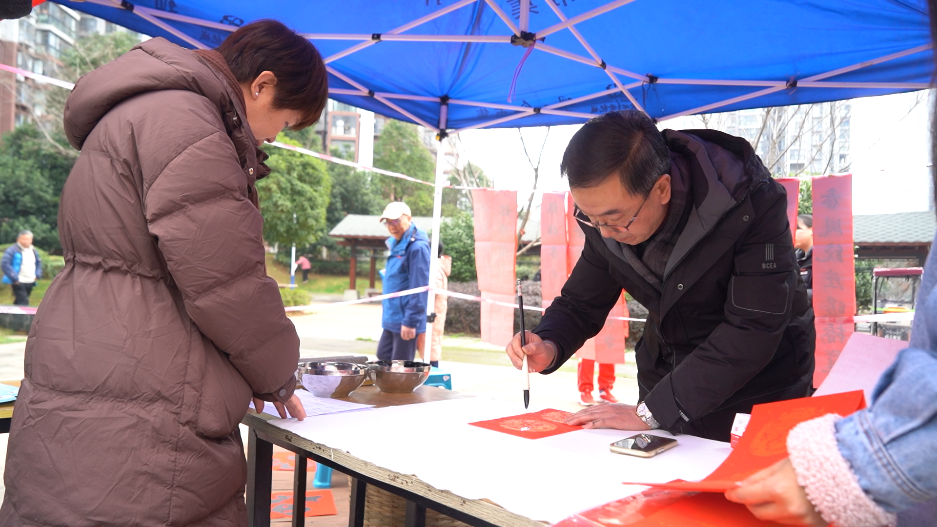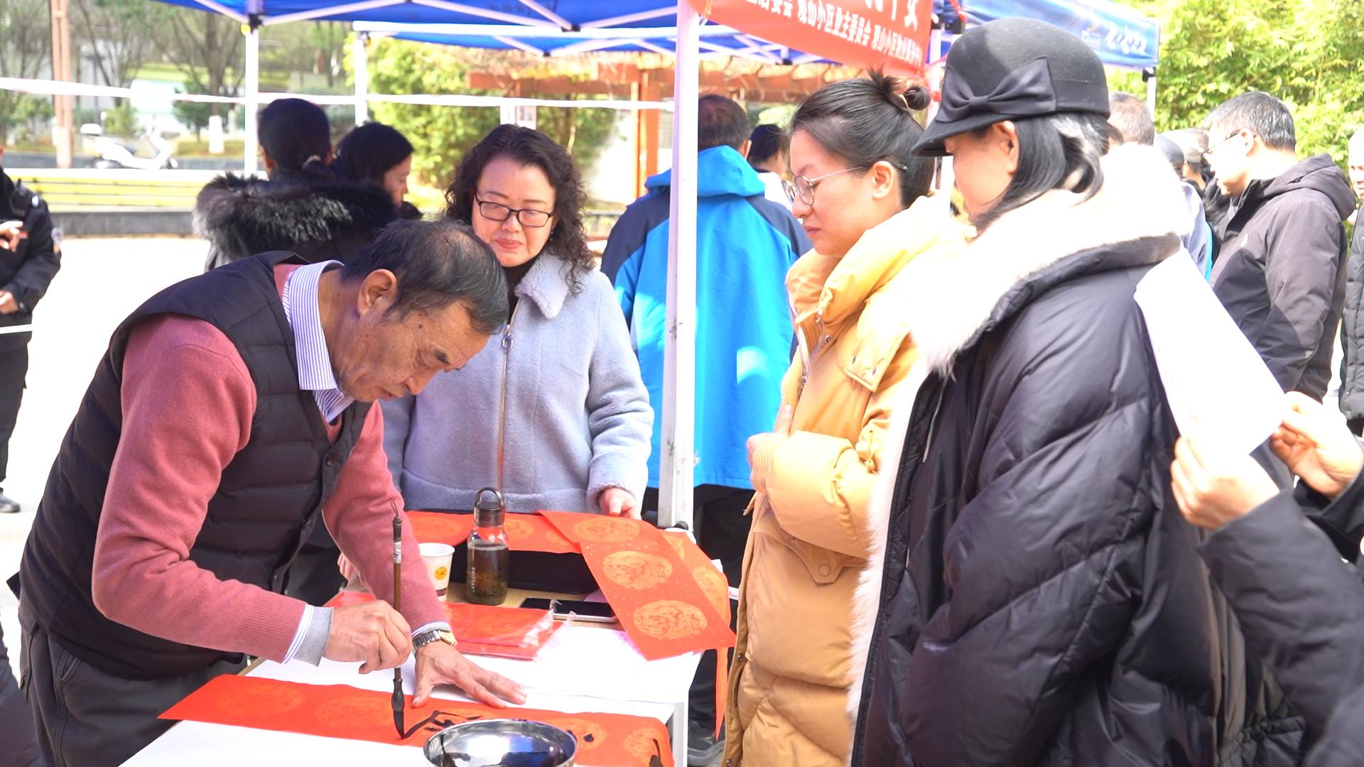 红色春联纸铺满长桌,书法家手中的毛笔行云流水,一副副带着墨香的春联在居民手中传递,成为连接传统与现代的温暖纽带。