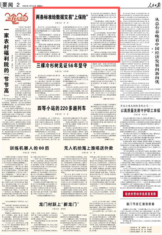 今天(2月21日),《人民日报》刊发新闻《两条标准给数据交易“上保险”(新春走基层)》。