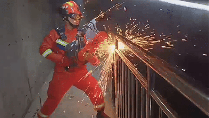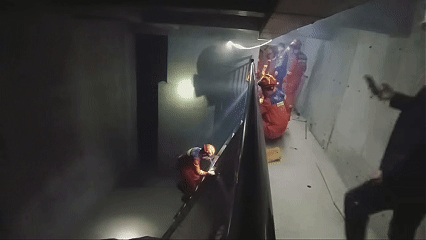 了解情况后,消防员立即使用无齿锯切开护栏,向下放入金属拉梯的通道,随后, 多名消防员下到池底小心翼翼地将被困人员转移到担架上,成功将其安全救出,并移交给现场医护人员。