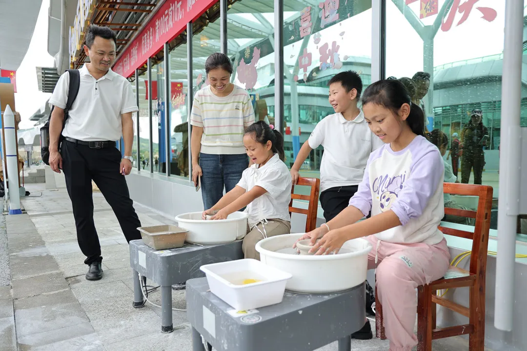 在牙舟陶制作体验区,在专业老师的指导下,孩子们充分发挥想象力,拉坯、塑形……不一会儿,泥团在手中变成各式各样的杯子、花瓶等陶器。