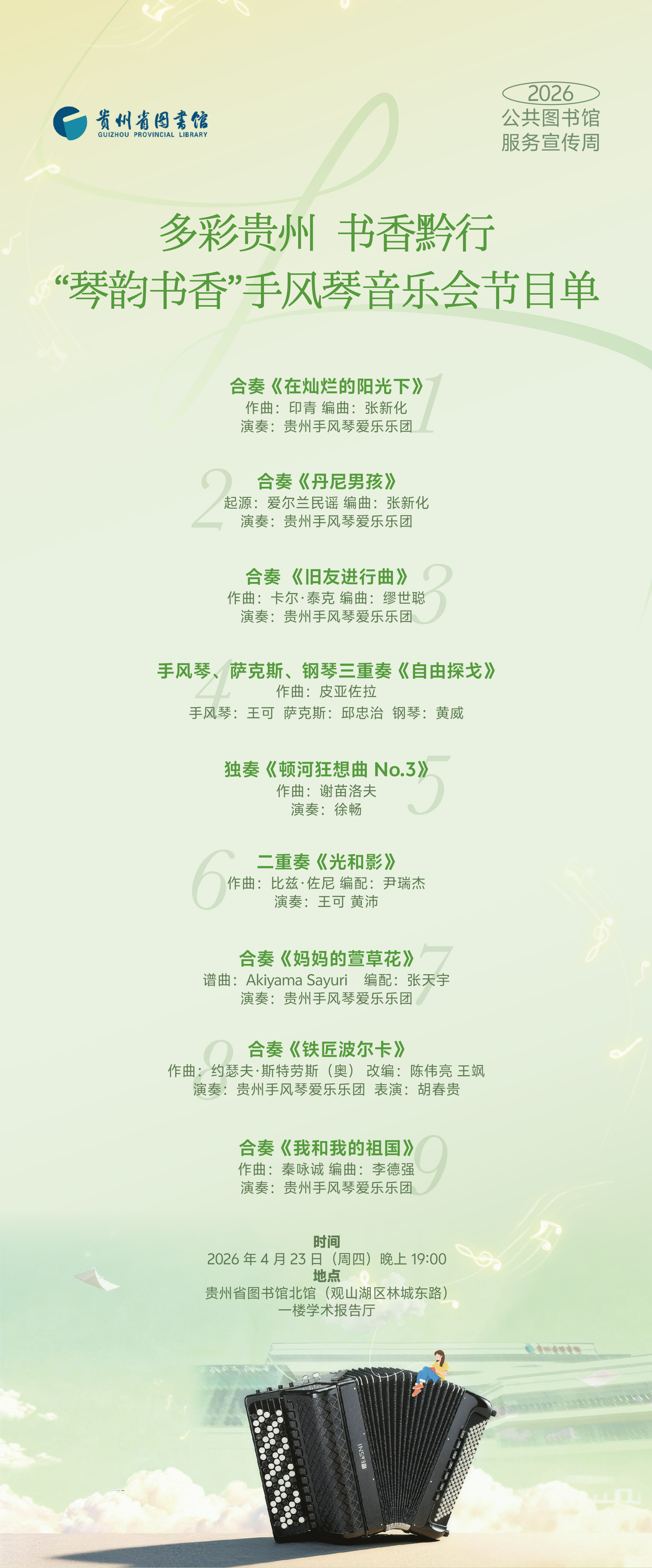 当夜幕降临,阅读将以听觉的形式缓缓流淌。4月23日晚19时,“琴韵书香”手风琴音乐会将在贵州省图书馆一楼学术报告厅诗意上演,读者可在书架环绕的空间内近距离感受手风琴的悠扬乐韵。演奏曲目精选了包括《在灿烂的阳光下》《自由探戈》《铁匠波尔卡》《我和我的祖国》等在内的多首中外经典名作,希望通过音符与书香的交融,让读者在静谧时光里,体验一种慢节奏、高浓度的艺术沉浸感,让阅读不止于视觉,更延伸至听觉与心灵。