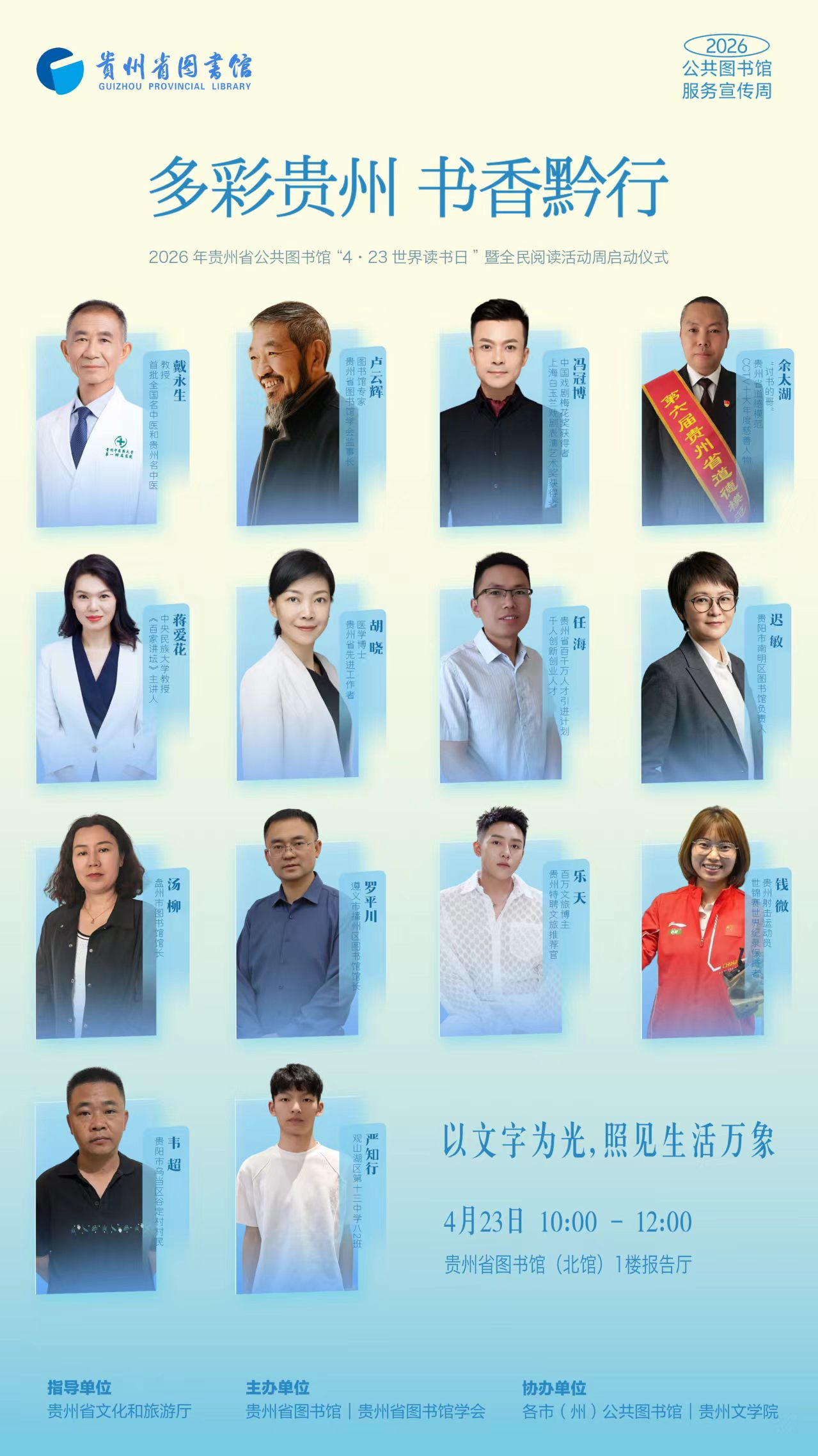 4月23日上午10点,14位来自不同领域的嘉宾,齐聚贵州省图书馆,共话阅读之美,有深耕杏林六十载的国医大师,有开坛讲史的学界翘楚,有以戏读心的戏剧名家,有以爱传书的慈善使者,有潜心科研的青年才俊;也有守护神经健康的医学博士、驰骋赛场的世界冠军、丈量山河的文旅博主、躬耕田野的农家汉子、逐光成长的少年学子,更有扎根基层、深耕文化的图书馆人们。访谈将围绕“以文字为光,照见生活万象”这一主题展开,嘉宾们将从各自独特的职业视角出发,分享阅读如何赋能专业创新、滋养精神世界。