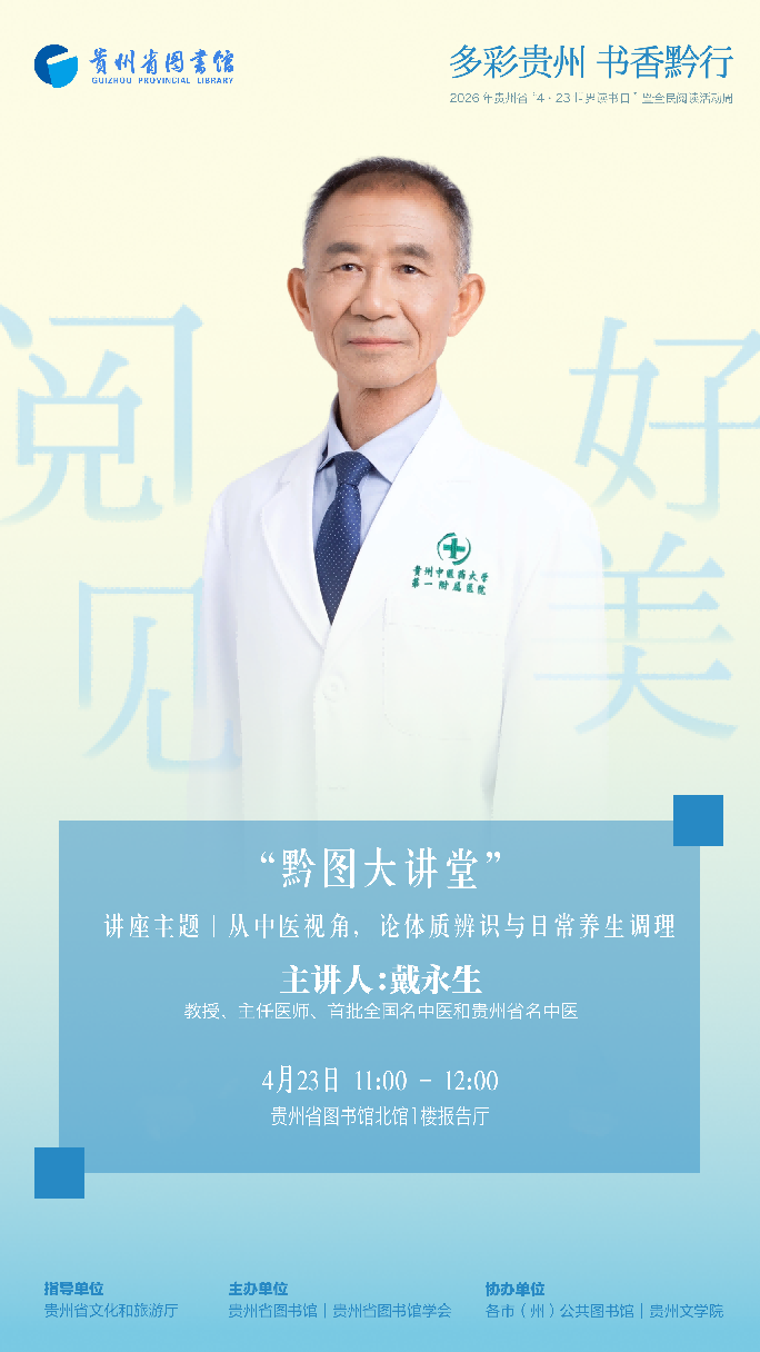 作为本次读书日活动的重要活动,上午,我们邀请了主任医师、首批全国名中医和贵州省名中医戴永生,为市民读者讲述题为《从中医视角,论体质辨识与日常养生调理》的讲座。下午,邀请了中央民族大学教授、博士生导师、中国古代史系主任,中央电视台《百家讲坛》栏目主讲人蒋爱花老师将带来题为《明月照千秋:大唐谜案与盛世疑云》的专题讲座,带领现场读者跨越时空藩篱。
