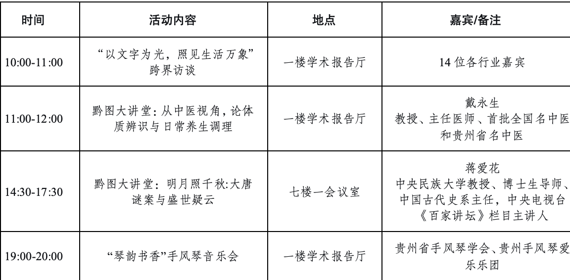 各项活动均向公众免费开放,部分场次因座位有限,建议读者关注贵州省图书馆官方网站或微信公众号,提前了解详情并有序入场。