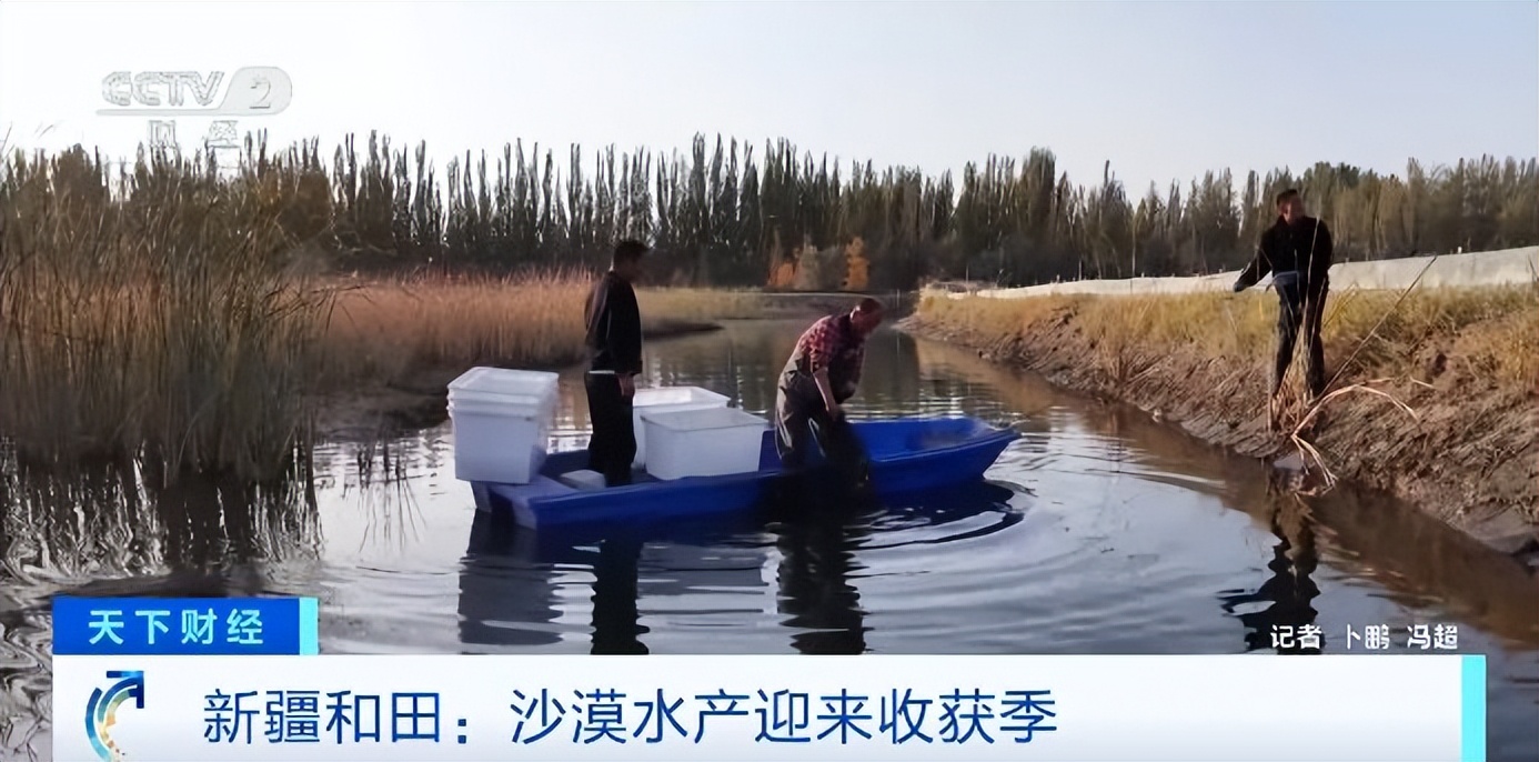 在新疆和田县的沙漠水产养殖基地里,养殖工人正划着小船,穿梭在水塘里起网收蟹。养殖工人告诉记者,现在正值螃蟹捕捞高峰期,平均一天的捕捞量在500公斤左右。
