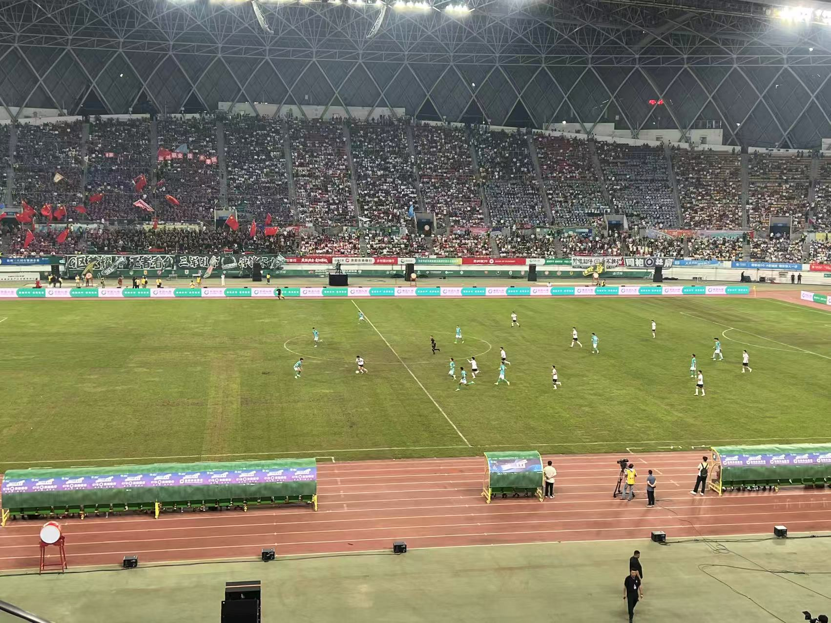 比赛期间,贵阳市奥体中心旌旗招展、人声鼎沸。看台上,来自全国各地的球迷热情高涨,一声声助威响彻赛场。其中,一句响亮的四川口音 “这球漂亮!” 引得周围观众会心一笑,也成为 “城超” 跨区域联动、全民参与的鲜活注脚。