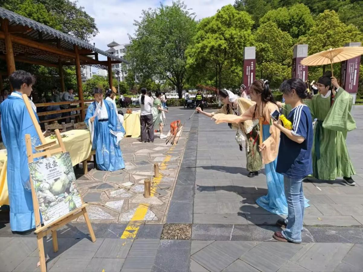 投壶、字谜、捶丸、木射等传统游戏吸引众多学子参与。古装NPC漫步其间,与游人诗词相和,佳句赢好礼。全场欢声不断,古韵与活力相融,将雅集气氛推向高潮。