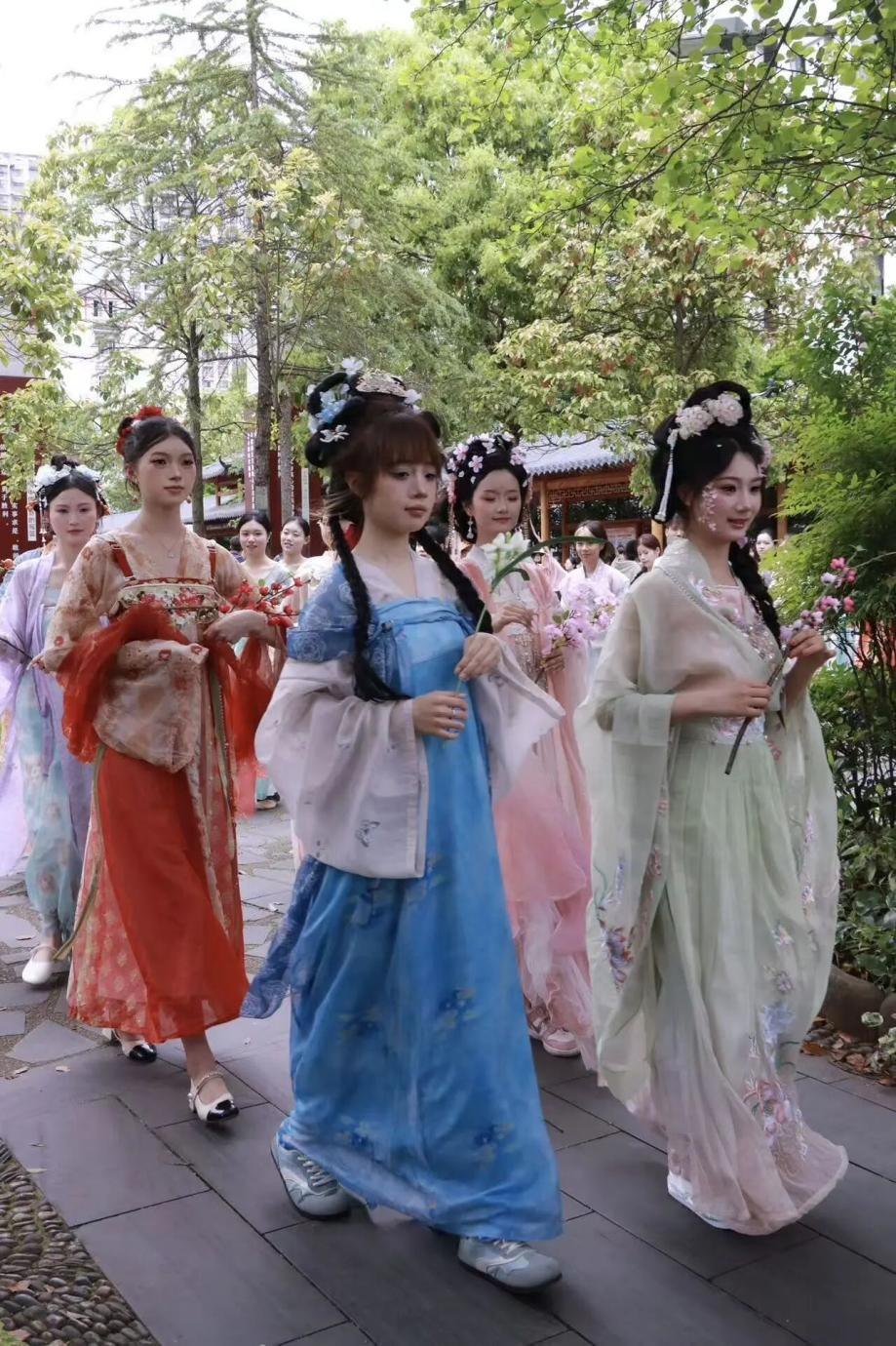 伴随着气势磅礴的龙狮献舞,活动正式拉开序幕。诗词朗诵、十二“花神”华服展示等节目轮番登场。庄重的祓禊仪式中,师生以柳枝沾露、清水拂身,依古礼祈福祛秽。随后,盛装队伍巡游至鼓楼,鼓乐齐鸣,奏响诗意序曲。
