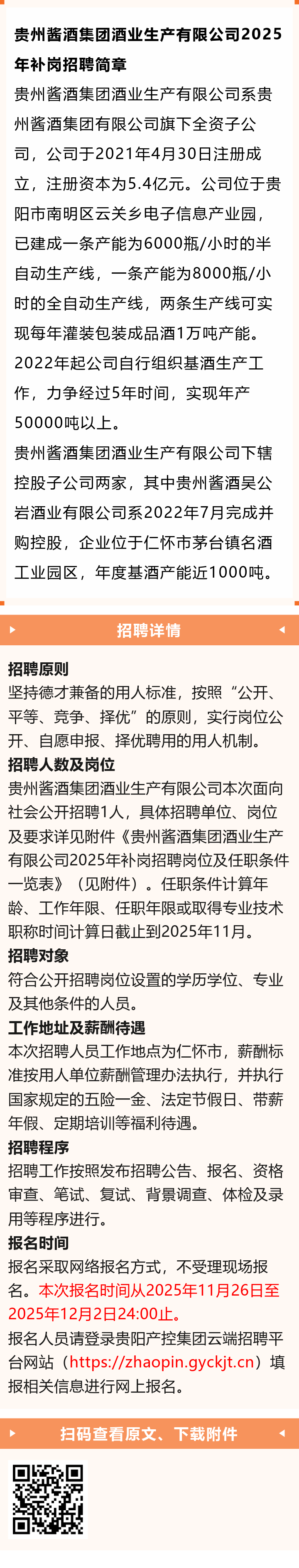贵州酱酒集团酒业生产有限公司招聘!报名截止时间:2025年12月2日!