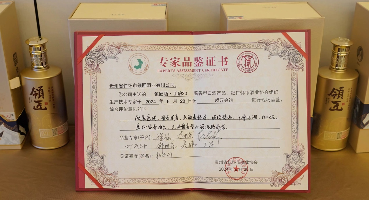 活动现场,行业专家先对领匠酒业研发的新品“领匠大师手酿20”进行品鉴,经过专家们的讨论,得出领匠新品的酒体微黄透明,酱香显著,老酒香舒适,酒体醇和,干净协调,后味长,空杯留香持久,大曲酱香型白酒风格典型的特点,酿酒大师徐强宣布了品评结果。