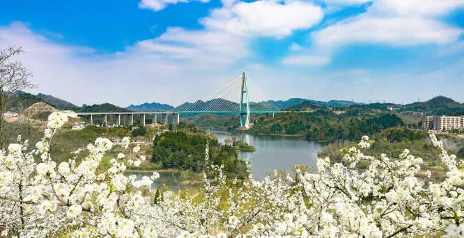 春日正好,百花湖畔各色鲜花正开。顺着一树梨花远眺,不远处的百花湖大桥横跨碧波,湖光桥影相映成趣。