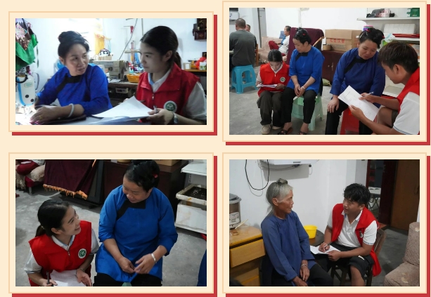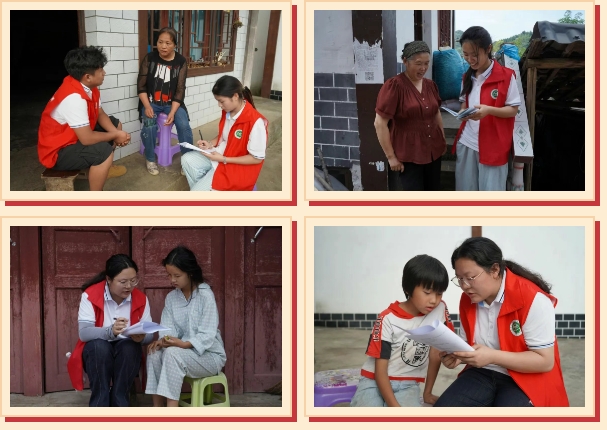 调研中志愿者们分组挨家挨户走访,与村民面对面交流,向村民发放调查问卷和推普宣传手册,宣传夏季防溺水和反诈骗相关知识,向困难群众、留守儿童赠送亲手撰写的“民族团结”福字和学习用具。大家通过“问卷+访谈+政策宣讲”模式,全面了解村民对国家通用语言文字的掌握程度、使用习惯、学习意愿及问题困难,为后续活动的开展奠定了坚实基础。